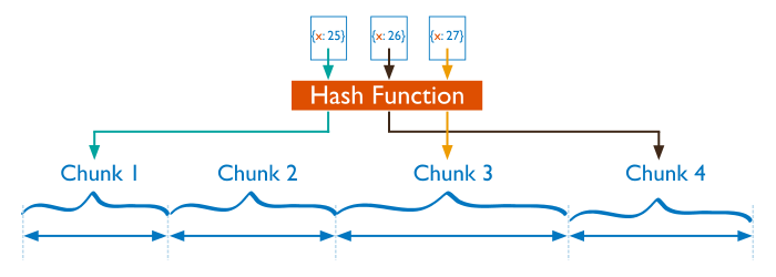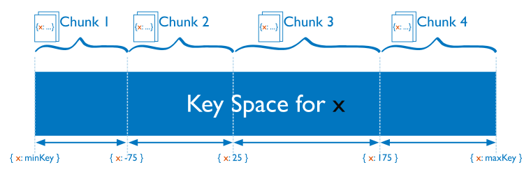 x 를 샤드 키로 설정하여 4개의 Chunks로 나누고, 각 Chunks 마다 범위를 가집니다.