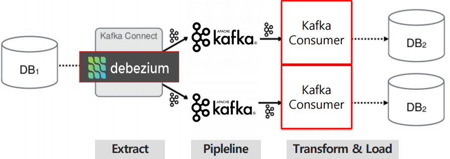 - Debezium 커넥터를 사용하는 다른 방법은 Embedded Engine을 사용하는 것이다. 이 경우 Debezium은 카프카 커넥터를 통해 실행되지 않고 자바 애플리케이션의 라이브러리로 사용된다. Embedded Engine는 변경 이벤트를 애플리케이션에서 바로 consuming하거나 변경 내역을 Amazon Kinesis와 같은 다른 메시지 브로커로 전달하고자 할 때 유용하다.